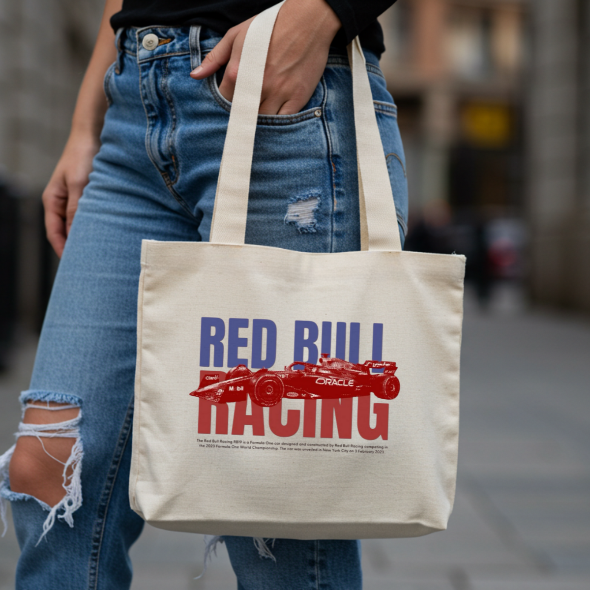 Essa ecobag apresenta um design inspirado na equipe Red Bull Racing, trazendo uma estampa vibrante com a ilustração de um carro de Fórmula 1 e o nome da equipe em destaque.